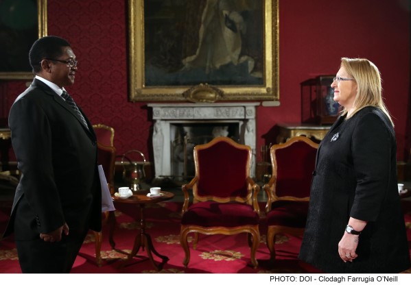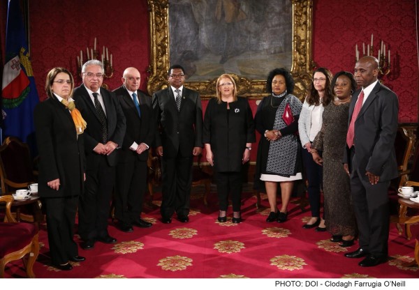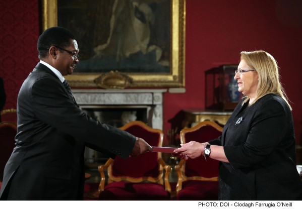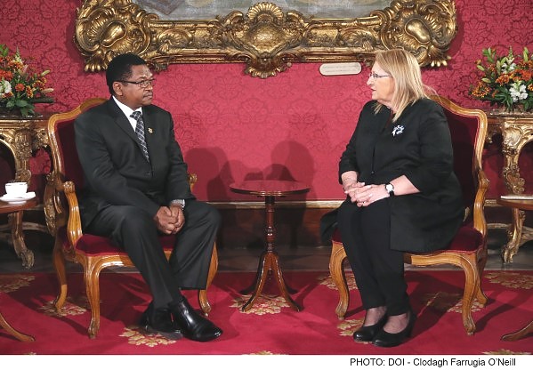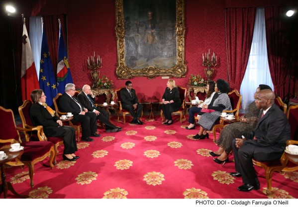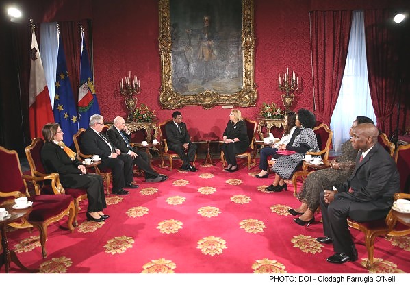 The High Commissioner of Tanzania H.E. George Kahema Madafa presenting his credentials to the President of Malta, H.E. Marie-Louise Coleiro Preca at the Presidential Palace.
