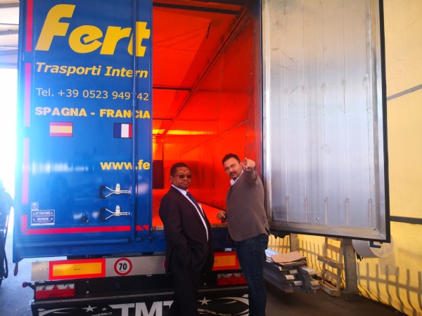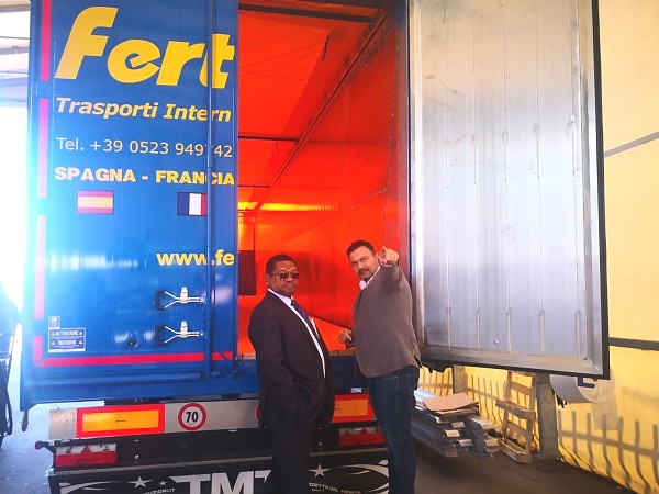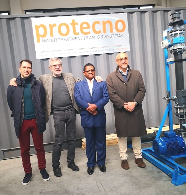 Pichani ni Mheshimiwa Balozi George Madafa akiwa na wamiliki wa Kampuni ya Protecno ambao ni Bwana Lorenzo Belbusti na Bwana Jacopo Belbusti. Kampuni hiyo hutengeneza Mitambo ya kuondolea chumvi kwenye Maji.