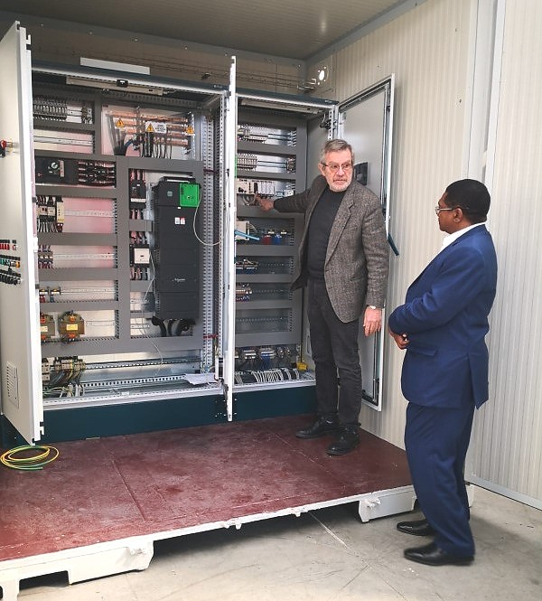 Mheshimiwa Balozi akikagua mmoja kati ya Mitambo mitatu (3) ya kuondolea chunvi kwenye Maji iliyotengezwa na Kiwanda cha Protecno kwa ajili ya Mji mdogo wa Gairo.