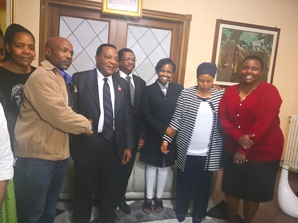 Tarehe 13 Desemba 2018, Kamishna Mkuu wa Kuzuia Madawa ya Kulevya nchini ndugu Rogers Siyanga alifika Ubalozini alipokuwa nchini Italy kwenye mafunzo ya muda mfipi. Pichani anaonekana Bwana Siyanga na mtaalamu aliyefuatana naye walipofika Ubalozini kumsalimia Mheshimiwa Balozi Madafa.