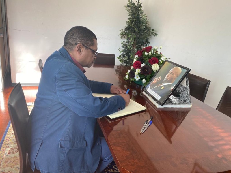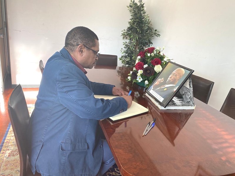 Balozi George Madafa akitia saini kitabu cha Maombolezo ya Rais Moi wa Kenya