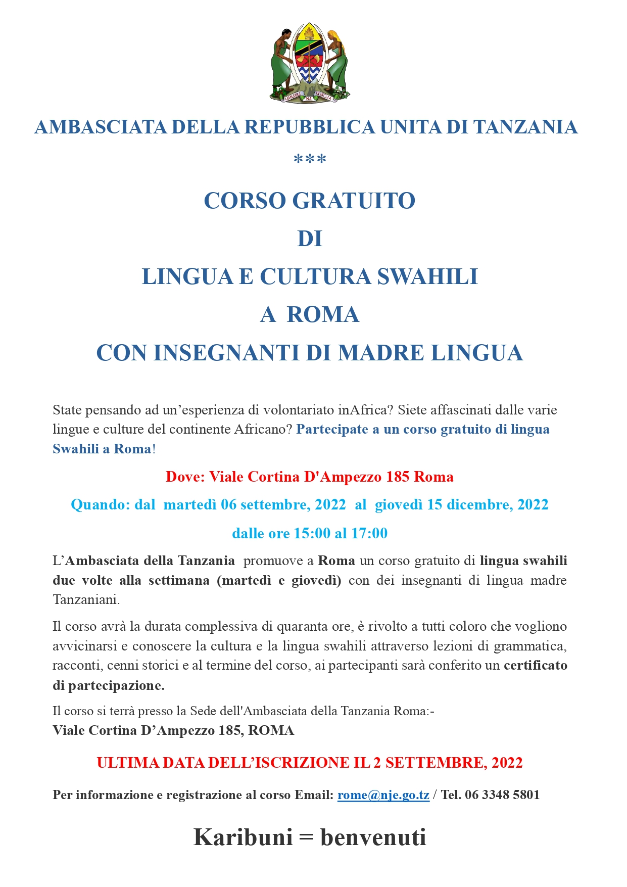 L' Ambasciata della Repubblica Unita di Tanzania desidera informare e invitare gli italiani interessati e di altre nazionalità residenti a Roma che dal 6 settembre al 15 dicembre 2022 terranno presso l'Ambasciata un Corso GRATUITO di lingua e cultura kiswahili ogni martedì e giovedì dalle 15:00 alle 17:00.